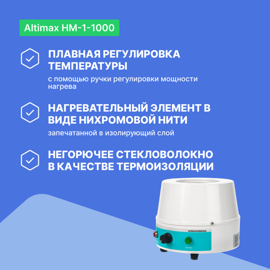 Лабораторный колбонагреватель Altimax HM-1-1000 — это надежное устройство, обеспечивающее равномерный нагрев жидкостей в круглодонных колбах объемом 1000 мл, без риска перегрева.