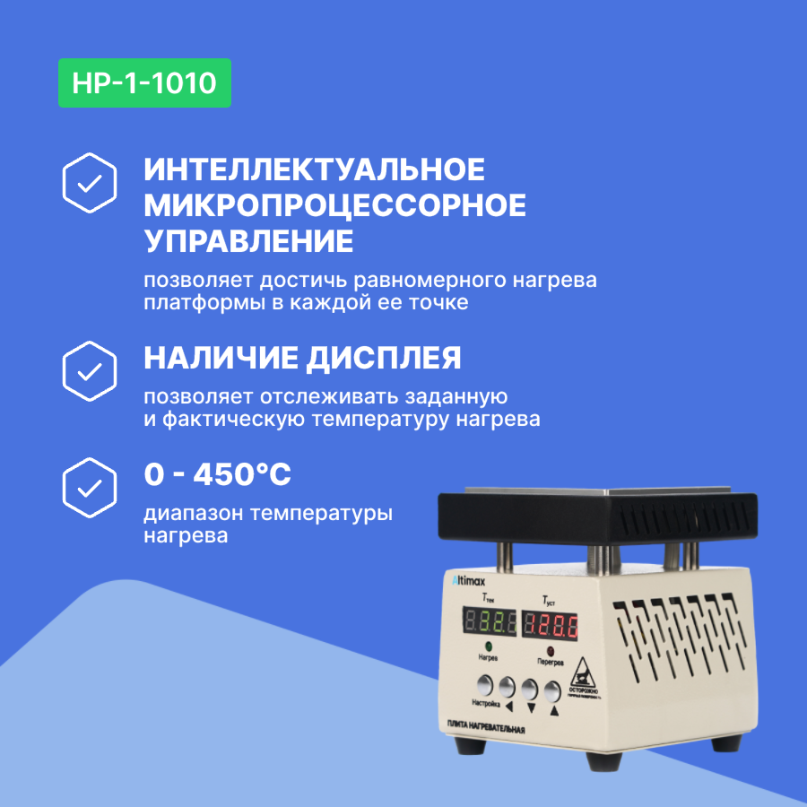 Altimax HP-1-1010 — это универсальная нагревательная плита, предназначенная для равномерного нагрева электронных компонентов, а также колб и другой лабораторной посуды. Прибор подходит для широкого спектра задач, включая ремонт мобильных телефонов, пайку алюминиевых пластин и светодиодных ламп, выпаривания и высушивания растворов, смесей и образцов и др.