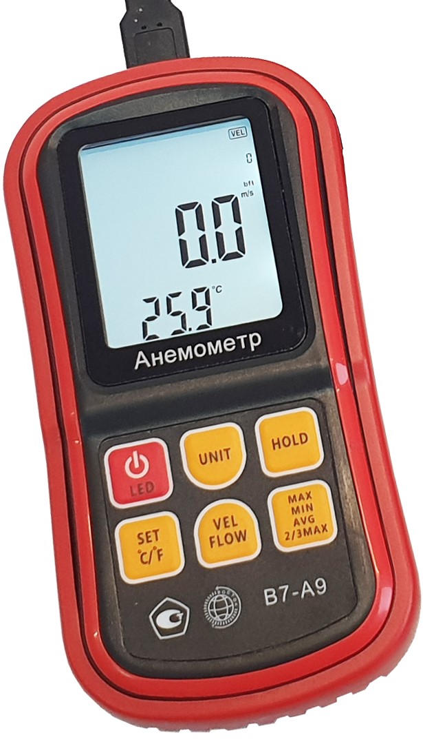 Модификация В7-А9 (термоанемометр, телескопический выносной зонд-крыльчатка) представляет собой мобильный многофункциональный микропроцессорный анемометр ручного формата. Он состоит из электронного блока с измерительным зондом выносного типа. Применяется для измерения температуры и скорости направленного воздушного потока и других газов в вентиляционных каналах и системах кондиционирования с вычислением объёма расхода, средних, максимальных и минимальных параметров воздушного потока.