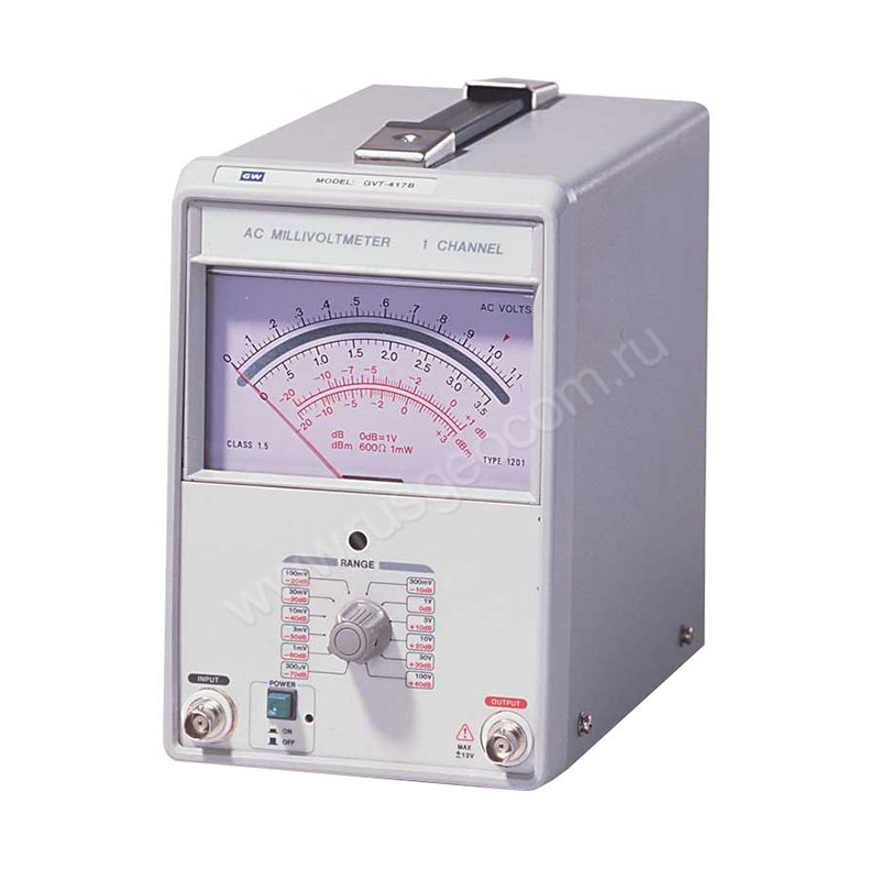 Вольтметр GW Instek GVT-417B – небольшой по размерам радиоизмерительный прибор, который позволяет выполнять замеры напряжения сети переменного тока, а также вычислять относительные уровни по напряжению и мощности. Он оснащен одним входным каналом для подключения измеряемого оборудования.