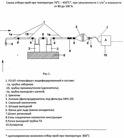 МК-ПУ «Аэрозоль» используется при отборе проб из источников загрязнения атмосферы (ИЗА) с высокой степенью химической агрессивности при атмосферном давлении 84-106,7 кПа, давлении в газоходе 101,3 +/- 50 к Па и скорости газового потока 4-32 м/с.