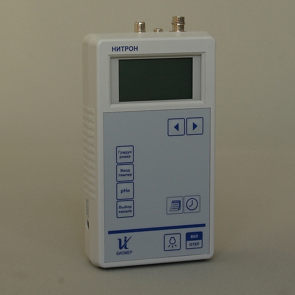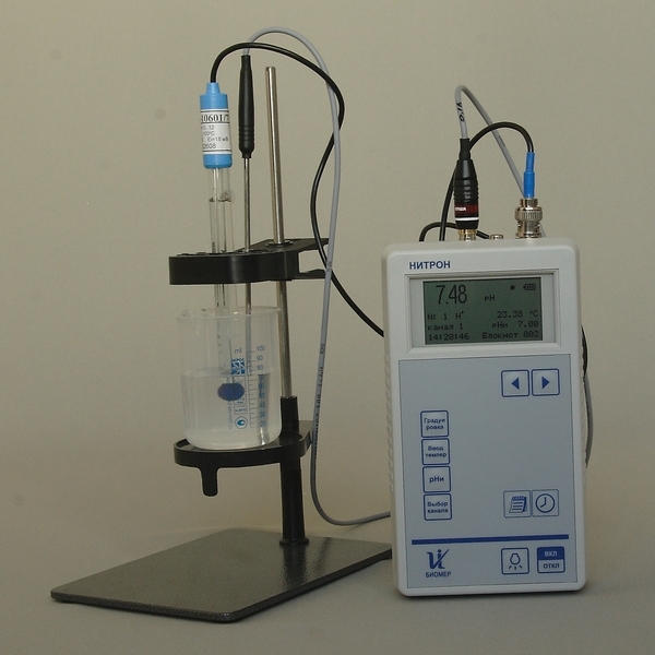 рН — метр — термометр Нитрон — рН предназначен для измерения активности ионов водорода (рН), окислительно-восстановительного потенциала Eh и температуры водных растворов. Принцип работы прибора основан на применении метода прямой потенциометрии. Определяет кислотность молока в градусах тернера.
