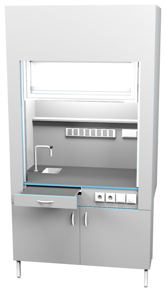 Шкаф вытяжной с сантехникой ШВ НВК 1200 ПЛАСТ+ (1200×716×2200). Описание: Вытяжные лабораторные шкафы применяются при работе с токсичными и вредными летучими материалами, с чистыми материалами, с растворением или разложением под температурной обработкой, при проведении анализа проб и многих других. Особенности: Полипропиленовая раковина, обладающая высокой химической стойкостью Химически стойкий кран из латуни с полипропиленовым напылением для подключения холодной воды Дополнительная подсветка сбоку с плавной регулировкой Выдвижной столик Вытяжка из нижней тумбы позволяет хранить в ней реактивы Ударопрочный подъемный экран легко поднимается одной рукой Экран в поднятом состоянии не увеличивает высоту шкафа Внутри рабочей камеры полочка для хранения реактивов Две влагозащищенных розетки с крышкой внутри рабочей камеры Специальные доводчики в тумбе позволяют закрывать тумбу бесшумно По заказу столешницы могут быть выполнены из: химстойкого пластика керамогранита (плитка) полипропилена нержавеющей стали монолитной керамики эпоксидного керамзита