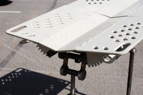 - Рабочая поверхность стола состоит из неподвижной центральной части и четырех подвижных секций с отверстиями для фиксации конечностей. Каждая секция регулируется отдельно, угол фиксируется с помощью специальных направляющих.