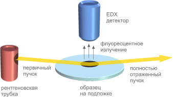 Метод полного внешнего отражения (TXRF) базируется на одних принципах, что и рентгенофлуоресцентный энергодисперсионный анализ (EDX), но есть одно важное отличие. В TXRF угол падения рентгеновского луча скользящий и составляет несколько миллирадиан, а в EDX угол падения луча составляет 45°. Это позволяет добиться полного отражения луча, т.е. он не поглощается материалом подложки образца. В сочетании с крайне малой толщиной исследуемого образца происходит значительное снижение фонового шума, а рассеяние первичного пучка минимизируется.