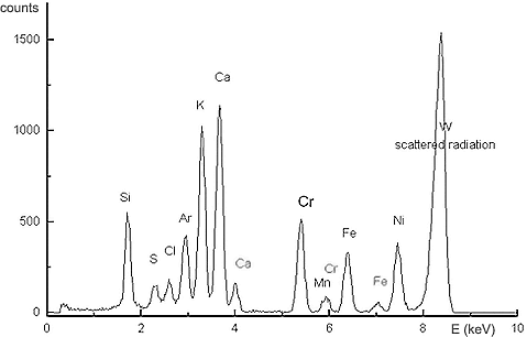 Ниже приведен пример спектра дистилированной воды содержащей 24.5 ppb хрома (Cr). Время съемки 500 секунд, излучение W анода с параметрами рентгеновской трубки 40 кВ 30 мА. Достижимый для данного образца предел определение составляет 35 ppt (что соответствует 3.5 µL).