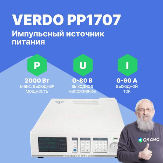 Импульсный источник питания постоянного тока VERDO PP1707 одноканальный характеризуется высокими значениями выходного напряжения до 80 В, тока до 60 А и мощности до 2000 Вт.